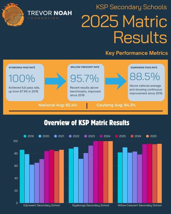 The Trevor Noah Foundation began in 2018 with a single partner school in Johannesburg, supporting orphaned youth through infrastructure upgrades, digital skills training, career guidance, and mental wellness programs, reaching over 500 students and 50 teachers.